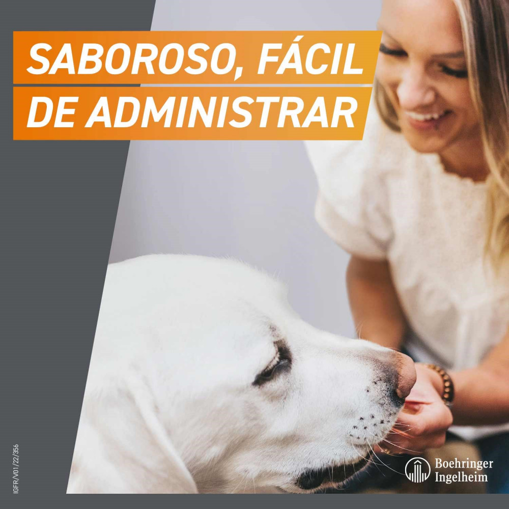 Comprimido mastigável altamente palatável, com a textura e consistência adequadas. Pode ser administrado com ou sem comida.