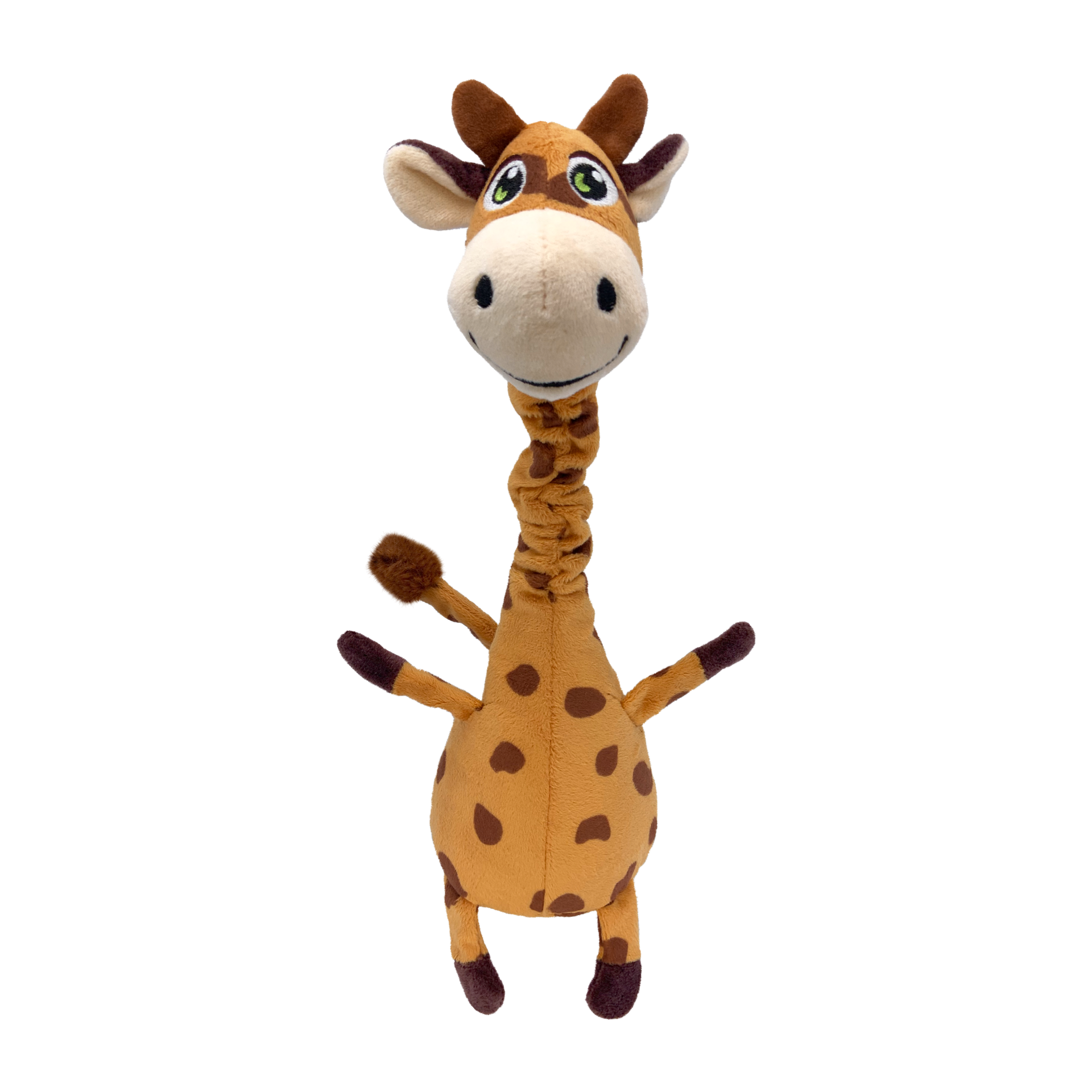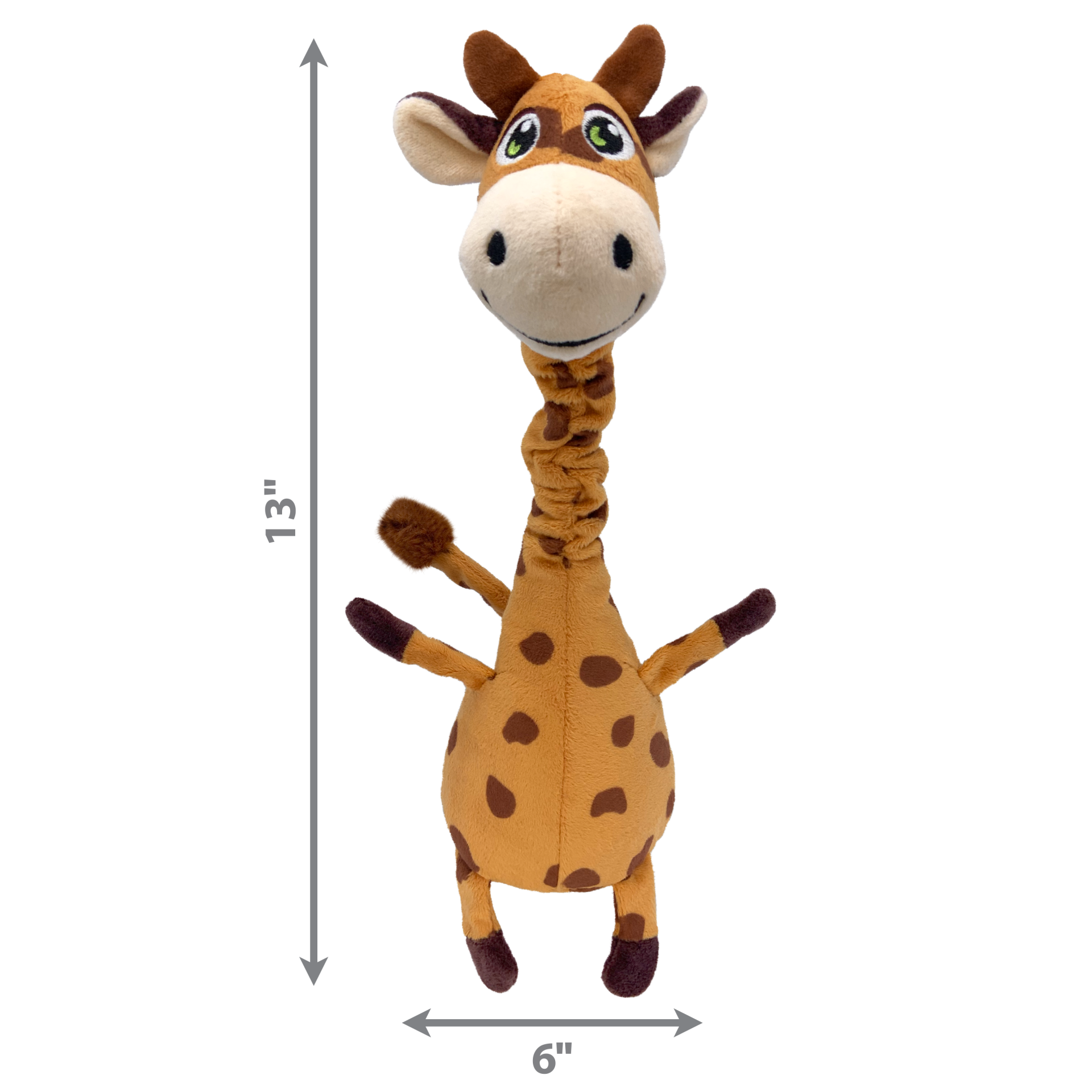 A KONG Shakers Bobz Girafa tem um cordão resistente e flexível em seu pescoço, permitindo que ela mexa a cabeça e incentive o pet a morder seu corpo longo e mole em brincadeiras que satisfaçam os instintos. O apito grave prolonga essa brincadeira, enquanto uma camada de reforço estende a diversão de puxar, buscar e arremessar.