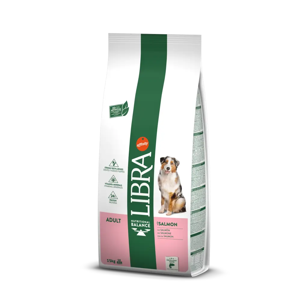 Libra Adult Salmon é um alimento seco para cães adultos, com 24% de proteína. Formulado com salmão, esta ração seca tem vitaminas e minerais que contribuem para o bem-estar geral do seu melhor amigo, favorecendo também ossos e dentes fortes. Uma dieta completa e equilibrada.