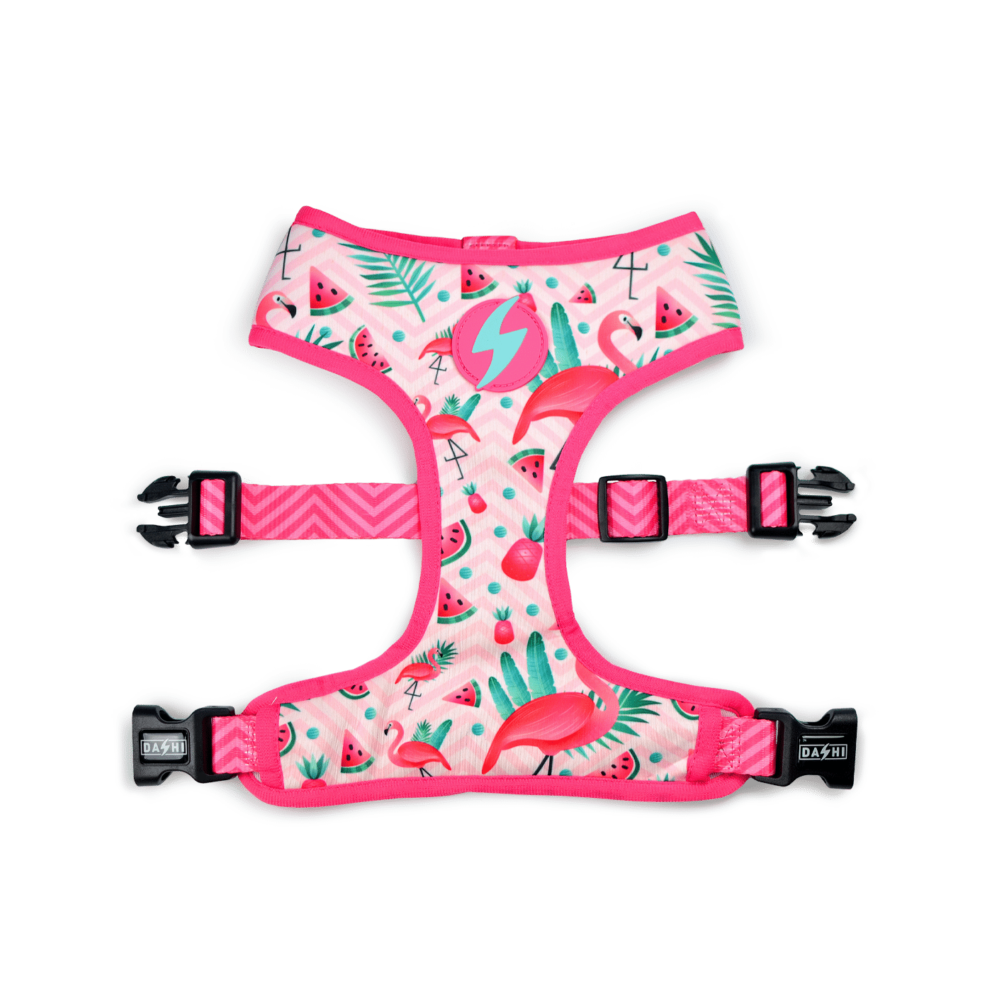 O nosso Neo Mesh™ reversível é feito de Neoprene de um lado e Poliéster do outro lado. Dessa forma, podes ter ao mesmo tempo um toque super suave e um material respirável para manter o teu cão fresco e confortável. As tiras ajustáveis são feitas em poliéster resistente, com um fecho de 4 pontos para a segurança do teu cão.