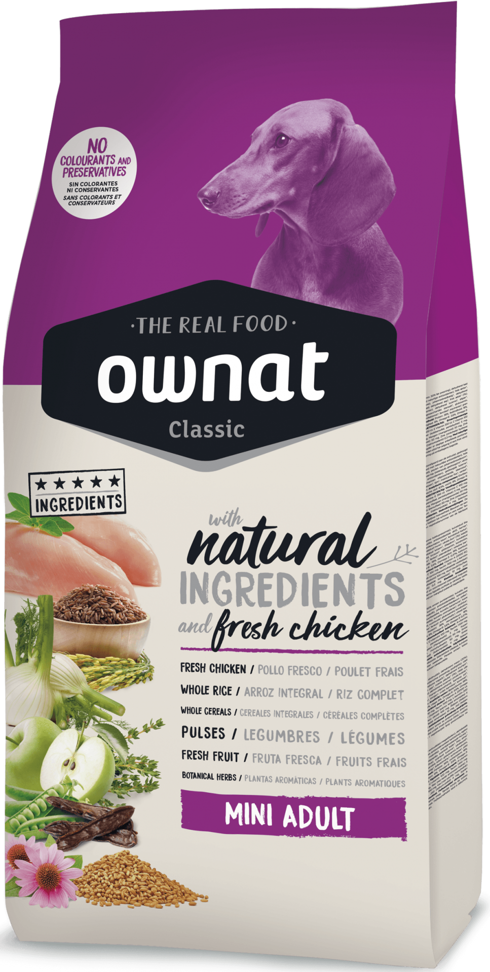 Carnes 34% (carnes desidratadas 24%, frango fresco* 10%), trigo integral* (18%), gordura de frango, milho integral* (8%), cevada integral* (8%), farelo de trigo* (5%), arroz integral* (5%), ervilhas inteiras* (4%), alfarroba triturada* (2%), maçã fresca* (1%), óleo de salmão, sementes de linhaça* (1%), polpa de beterraba, fruto-oligossacarídeos e mano-oligossacarídeos, levedura de cerveja* (0,5%), ervas botânicas 0,02% (funcho*, equinácea*, tomilho*), yucca shidigera. *Ingredientes naturais