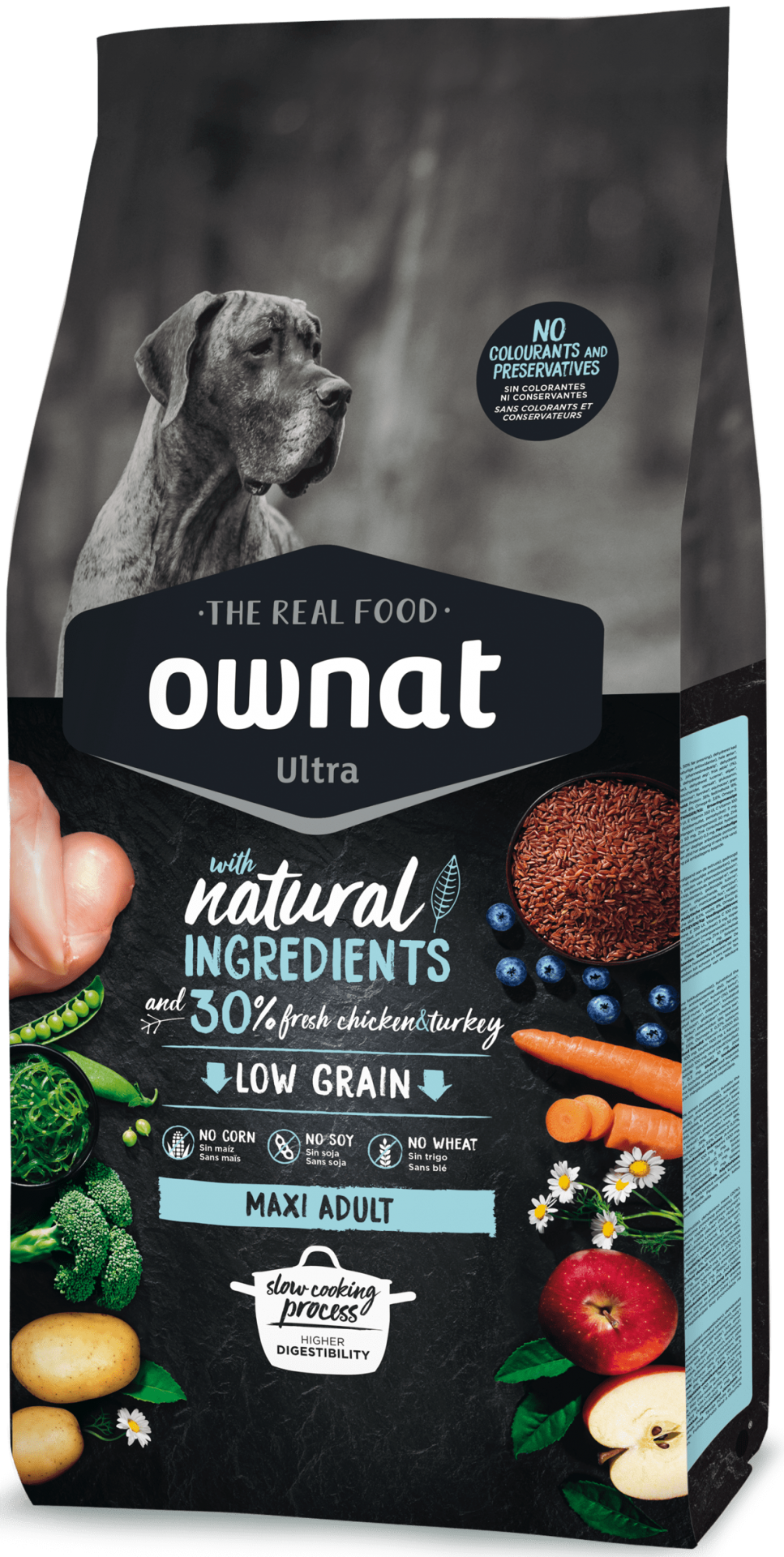 Carne fresca de frango e peru* (30% mín. antes de cozinhar), carne desidratada (20%), raízes de mandioca*, ervilhas inteiras*, arroz integral*, gordura de frango (preservada com antioxidantes naturais), favas inteiras*, cevada integral*, batata desidratada*, proteína hidrolisada de frango (2,5%), levedura de cerveja*, polpa de beterraba, vagem de alfarroba*, óleo de salmão (preservado com antioxidantes naturais), sementes de linhaça*, maçã fresca* (1%), cenoura fresca* (0,5%), brócolos frescos* (0,5%), sal-gema*, alfafa desidratada*, raízes de chicória (FOS)*, extrato de leveduras (MOS), algas marinhas desidratadas*, glucosamina, yucca schidigera, sulfato de condroitina, arandos*, chá verde*, equinácea*, flor de camomila*. *Ingredientes naturais