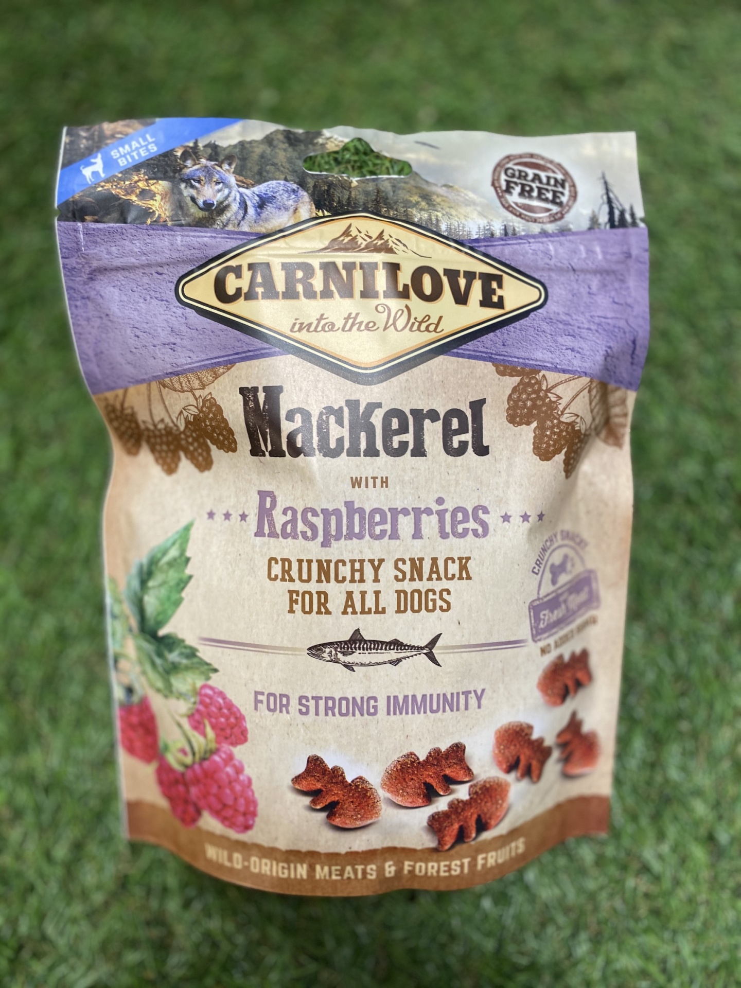 Carnilove Dog Crunchy Snack Mackerel & Raspberries para cães. Com framboesas, fonte natural de antioxidantes, para reforçar o sistema imunitário.