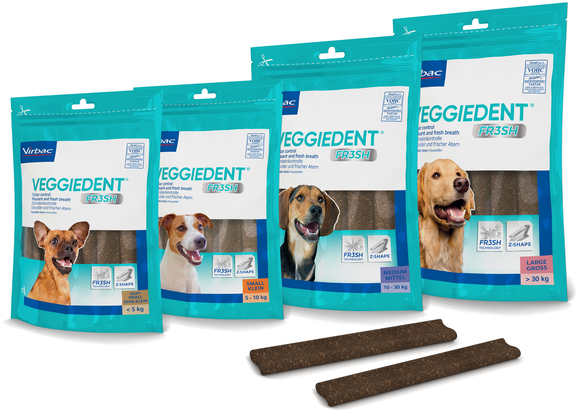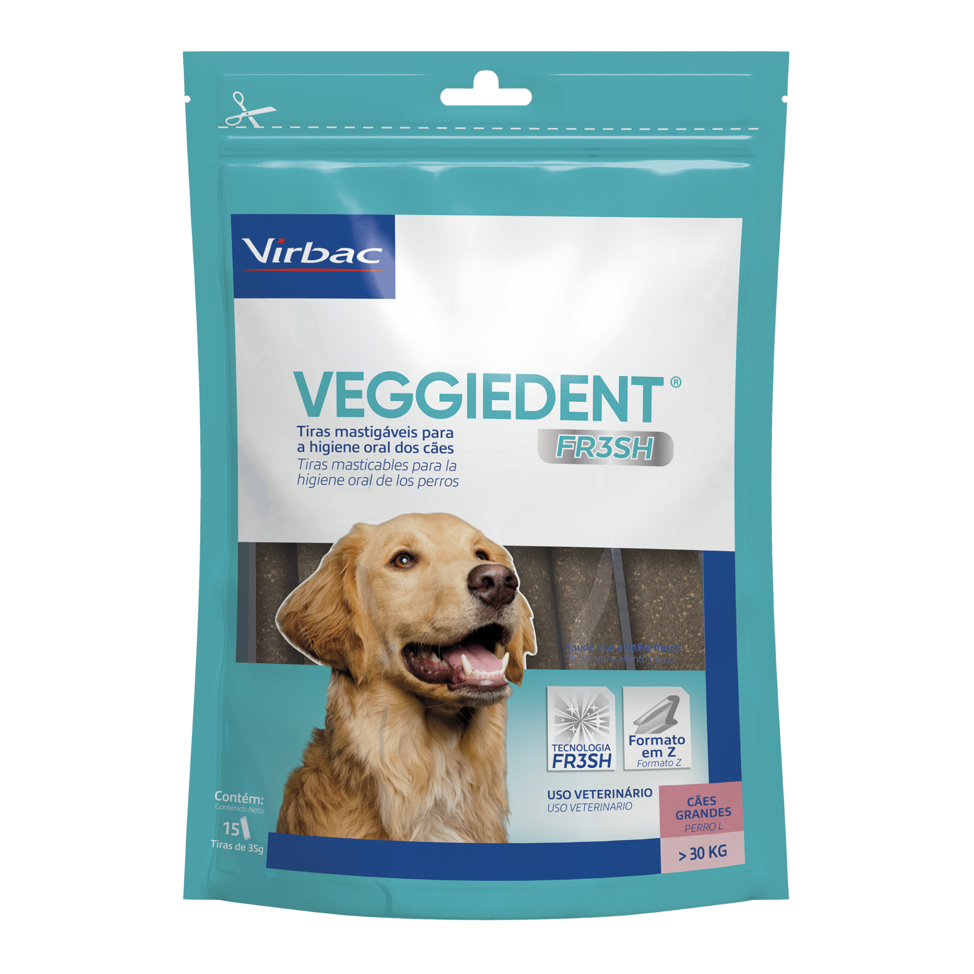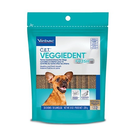 As barras mastigáveis VEGGIEDENT® com Tecnologia FR3SHTM ajudam a manter um hálito fresco e saudável. As barras mastigáveis VEGGIEDENT® apresentam um inovador formato em Z que facilita a preensão e mastigação pelo seu cão. Este formato, juntamente com o tamanho e a textura, ajuda a reduzir a formação do tártaro e da placa dentária, melhorando a limpeza dentária.